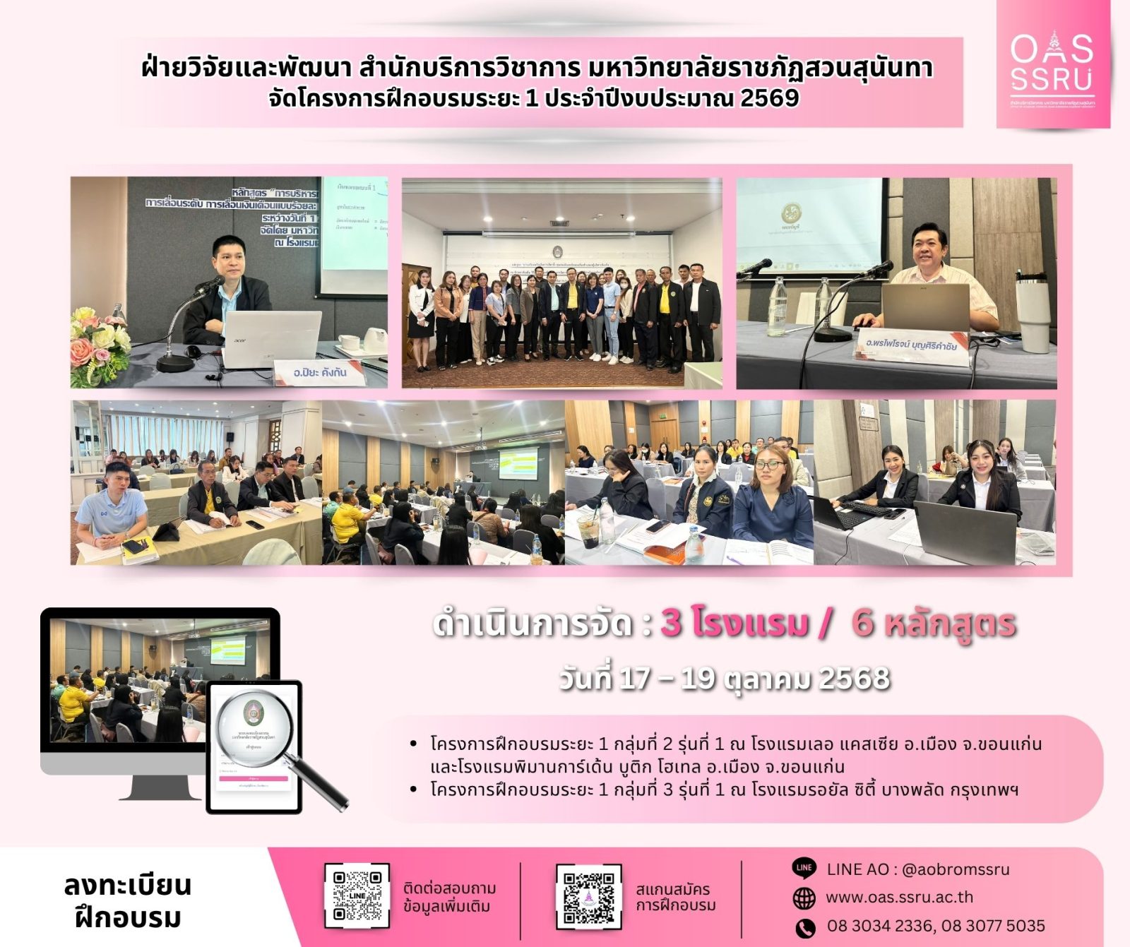 ข่าววิชาการ ฝ่ายวิจัยและพัฒนา สำนักบริการวิชาการ จัดโครงการฝึกอบรมระยะ 5 ประจำปีงบประมาณ 2568 จำนวน 2 โรงแรม 6 หลักสูตร (วันที่ 15 – 17 สิงหาคม 2568) สิงหาคม 20, 2025