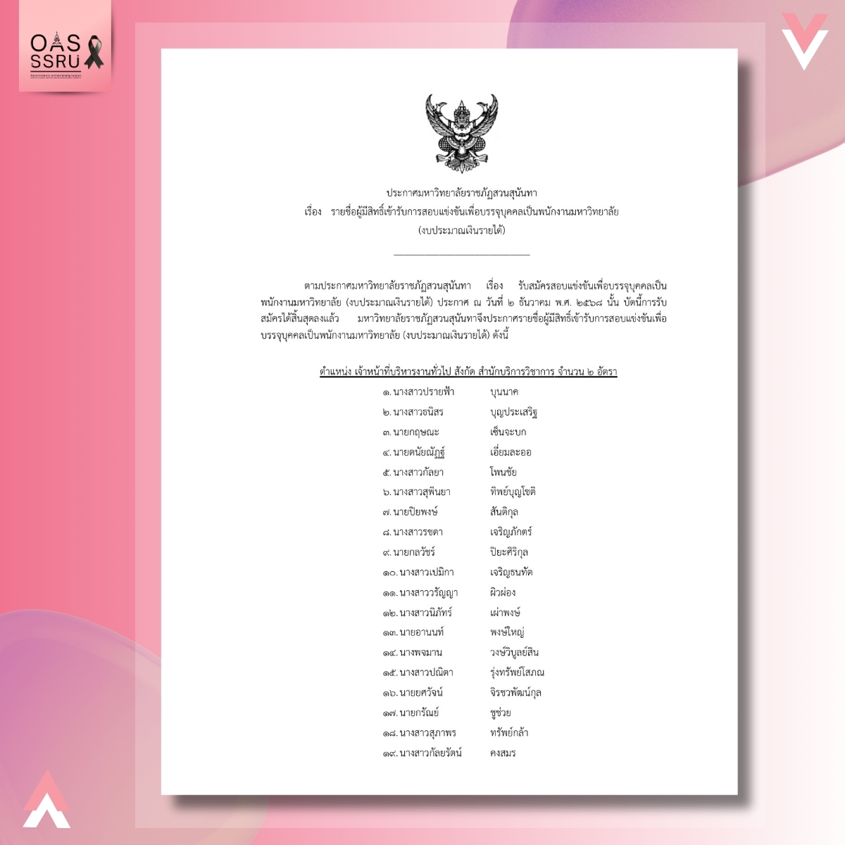 มหาวิทยาลัยราชภัฏสวนสุนันทา ประกาศรายชื่อผู้มีสิทธิ์เข้ารับการสอบแข่งขันเพื่อบรรจุบุคคลเป็นพนักงานมหาวิทยาลัย (งบประมาณเงินรายได้) ตำแหน่ง เจ้าหน้าที่บริหารงานทั่วไป สังกัด สำนักบริการวิชาการ จำนวน 2 อัตรา ให้ผู้มีสิทธิ์เข้ารับการสอบแข่งขันเข้าสอบ ในวันที่ 14 มกราคม 2569 เวลา 09.00 น. เป็นต้นไป ณ คณะมนุษยศาสตร์และสังคมศาสตร์ อาคาร 35 ชั้น 2 ห้องประชุมนิภานภดล