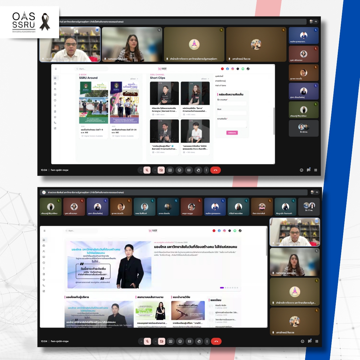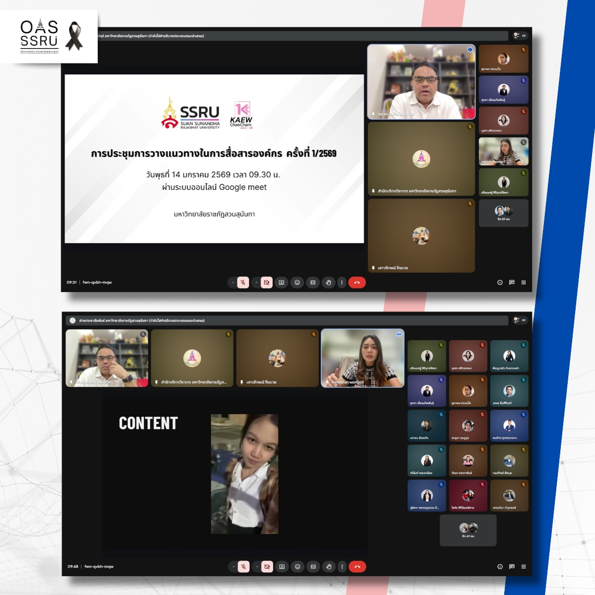 วันที่ 14 มกราคม 2569 สำนักบริการวิชาการ นำโดย นางสาวเสาวลักษณ์ จีนบวย รักษาการในตำแหน่งหัวหน้าสำนักงานฯ พร้อมด้วยนายจิรายุ หาฤทธิ์ เจ้าหน้าที่บริหารงานทั่วไป ผู้ปฏิบัติงานด้านสื่อและประชาสัมพันธ์ เข้าร่วมประชุมการวางแผนแนวทางในการสื่อสารองค์กร ครั้งที่ 1/2569 โดยมี รองศาสตราจารย์ ดร.คมสัณ โสมณวัตร รองอธิการบดีฝ่ายบริหาร มหาวิทยาลัยราชภัฏสวนสุนันทา เป็นประธานการประชุม เพื่อรับทราบนโยบายและแผนการประชาสัมพันธ์ พร้อมทั้งให้การดำเนินงานด้านประชาสัมพันธ์เป็นไปในทิศทางเดียวกัน โดยเข้าร่วมประชุมผ่านระบบออนไลน์ Google Meet