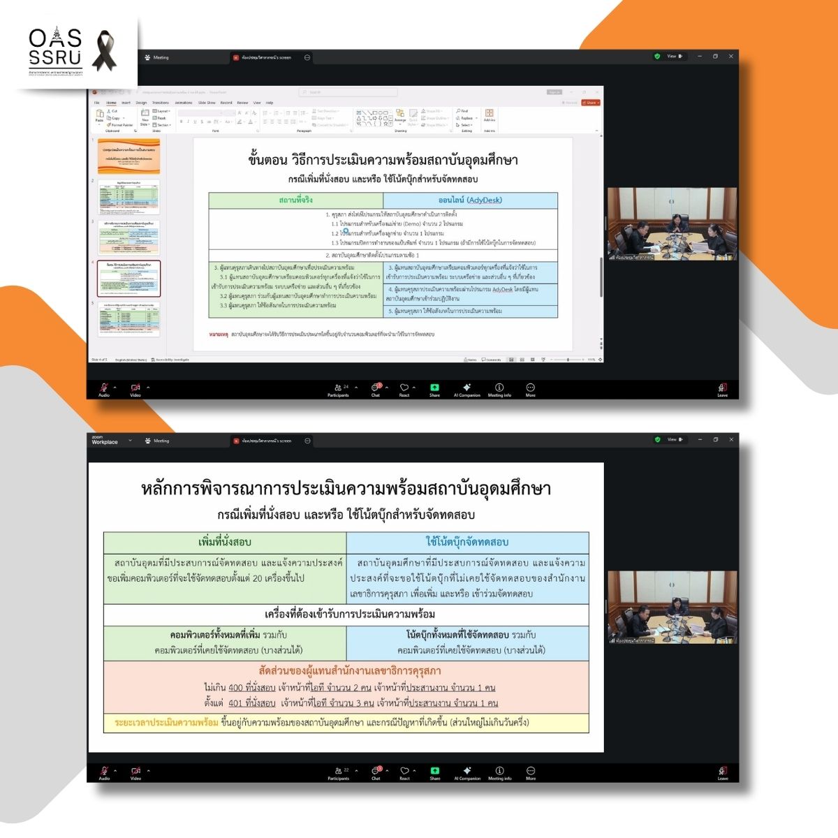 วันที่ 4 กุมภาพันธ์ 2569 เวลา 13.30 น. ฝ่ายทดสอบและรับรองวิชาชีพ สำนักบริการวิชาการ มหาวิทยาลัยราชภัฏสวนสุนันทา นำโดย นางสาววลัยกร โกมลสิงห์ ผู้ช่วยผู้อำนวยการฝ่ายทดสอบและรับรองวิชาชีพ มหาวิทยาลัยราชภัฏสวนสุนันทา พร้อมด้วยนางสาวเนตรทราย สุพรรณ์หนู อำนวยการสนามสอบมหาวิทยาลัยราชภัฏสวนสุนันทา เข้าร่วมประชุมประเมินความพร้อมในการเป็นสนามสอบร่วมกับสำนักงานเลขาธิการคุรุสภา เพื่อรับฟังการชี้แจงขั้นตอนและแนวทางการประเมินความพร้อม ทั้งในรูปแบบออนไลน์และแบบออนไซต์ สำหรับการเตรียมการดำเนินการสอบในเดือนพฤษภาคม 2569 โดยมีผู้บริหารและผู้แทนจากแต่ละสนามสอบเข้าร่วมประชุมโดยพร้อมเพรียงกัน ผ่านระบบออนไลน์ Zoom Meeting