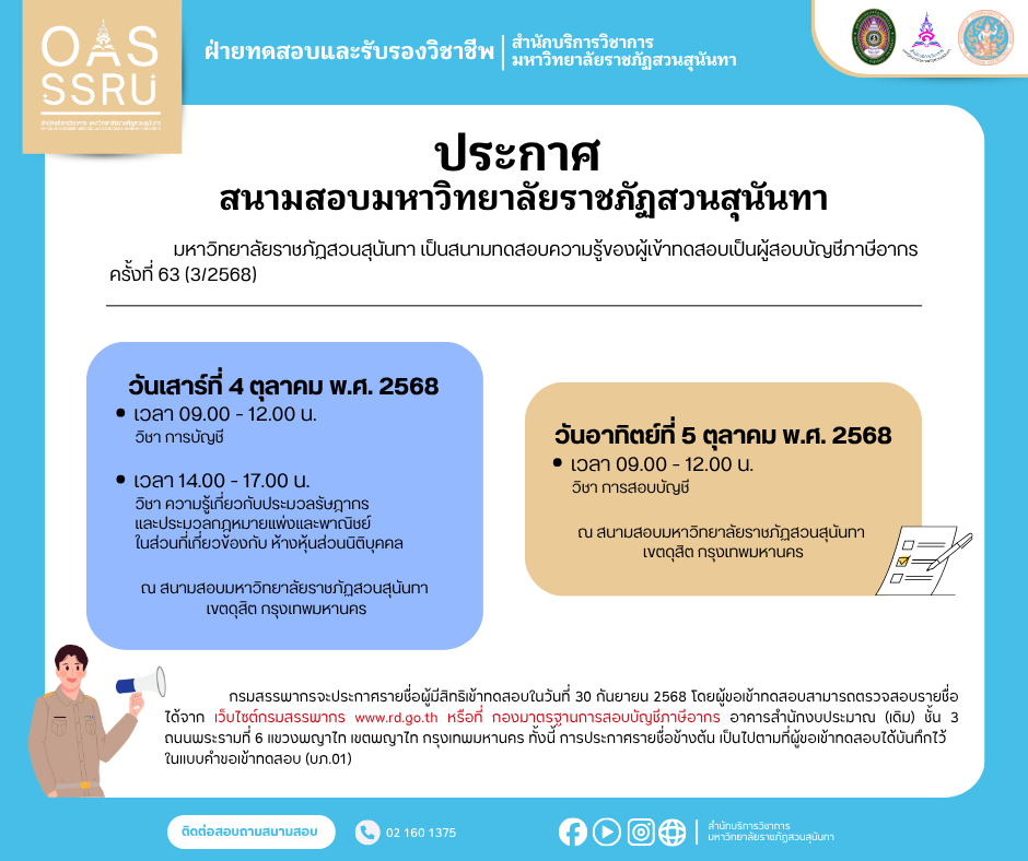 ประกาศจากสนามสอบ มหาวิทยาลัยราชภัฏสวนสุนันทา เป็นสนามทดสอบความรู้ของผู้เข้าทดสอบเป็นผู้สอบบัญชีภาษีอากร ครั้งที่ 63 (3/2568)