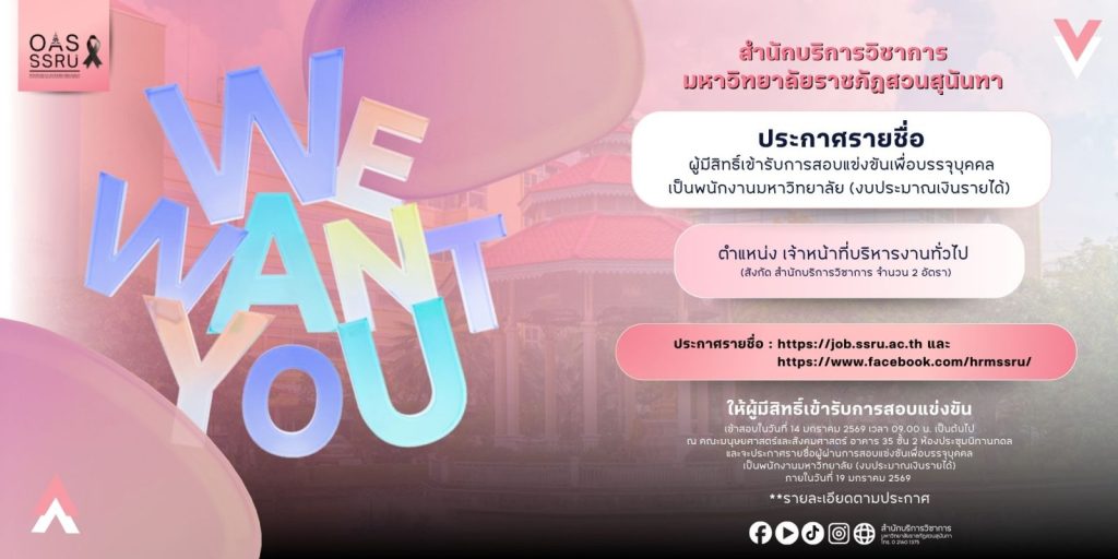 มหาวิทยาลัยราชภัฏสวนสุนันทา ประกาศรายชื่อผู้มีสิทธิ์เข้ารับการสอบแข่งขันเพื่อบรรจุบุคคลเป็นพนักงานมหาวิทยาลัย (งบประมาณเงินรายได้) ตำแหน่ง เจ้าหน้าที่บริหารงานทั่วไป สังกัด สำนักบริการวิชาการ จำนวน 2 อัตรา