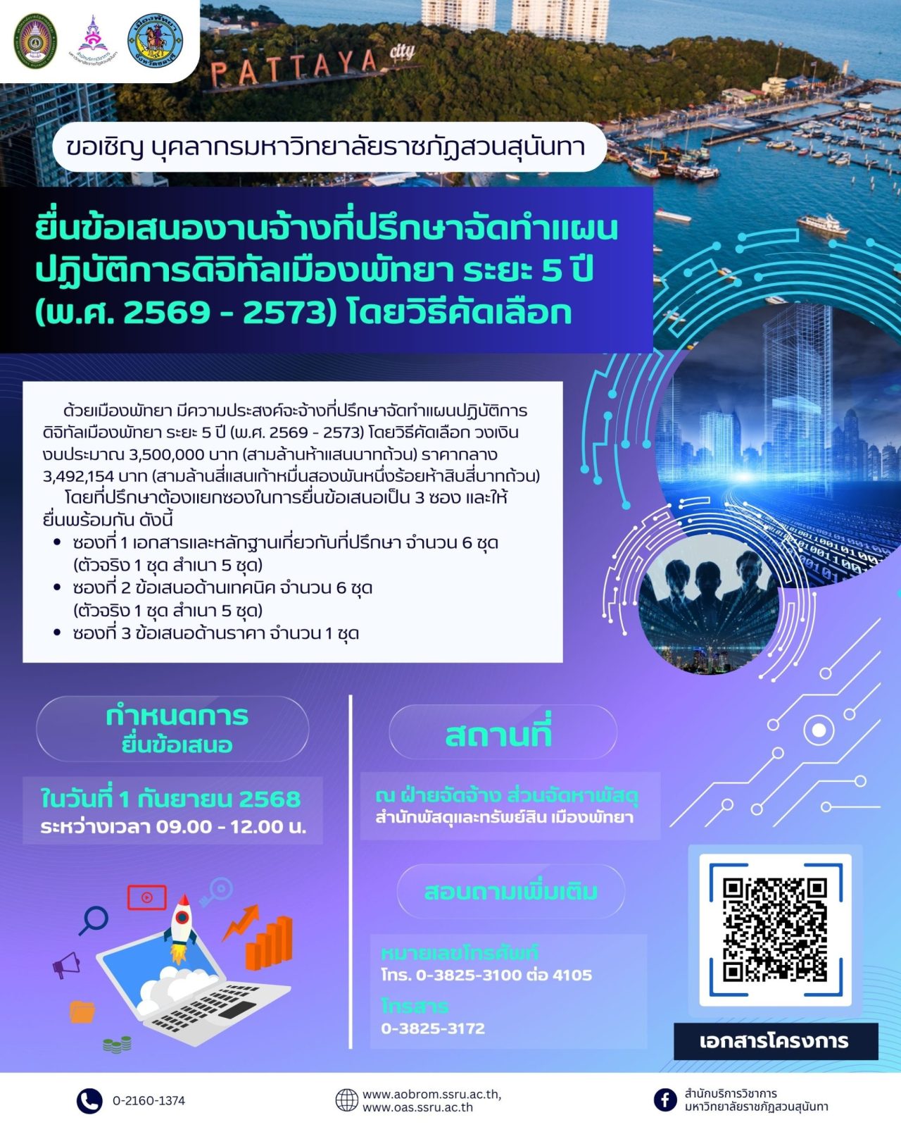 ข่าวกิจกรรม ขอเชิญ บุคคลากรมหาวิทยาลัยราชภัฏสวนสุนันทา ยื่นข้อเสนอจ้างที่ปรึกษาจัดทำแผนปฏิบัติการดิจิทัลเมืองพัทยา ระยะ 5 ปี สิงหาคม 25, 2025