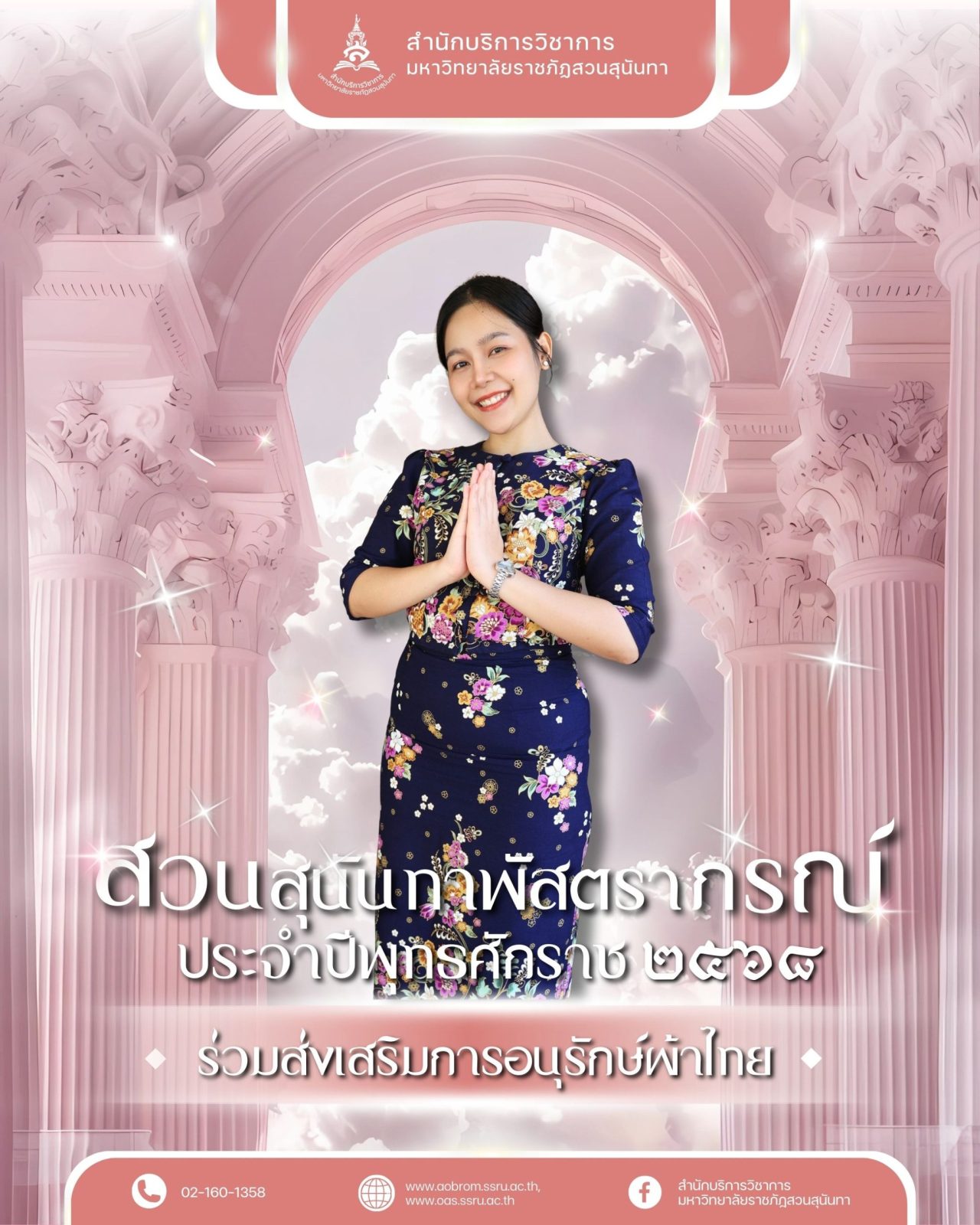 ข่าวกิจกรรม สำนักบริการวิชาการ มหาวิทยาลัยราชภัฏสวนสุนันทา ร่วมส่งเสริมการอนุรักษ์ผ้าไทย ในโครงการ “สวนสุนันทาพัสตราภรณ์ ประจำปี 2568” กันยายน 5, 2025