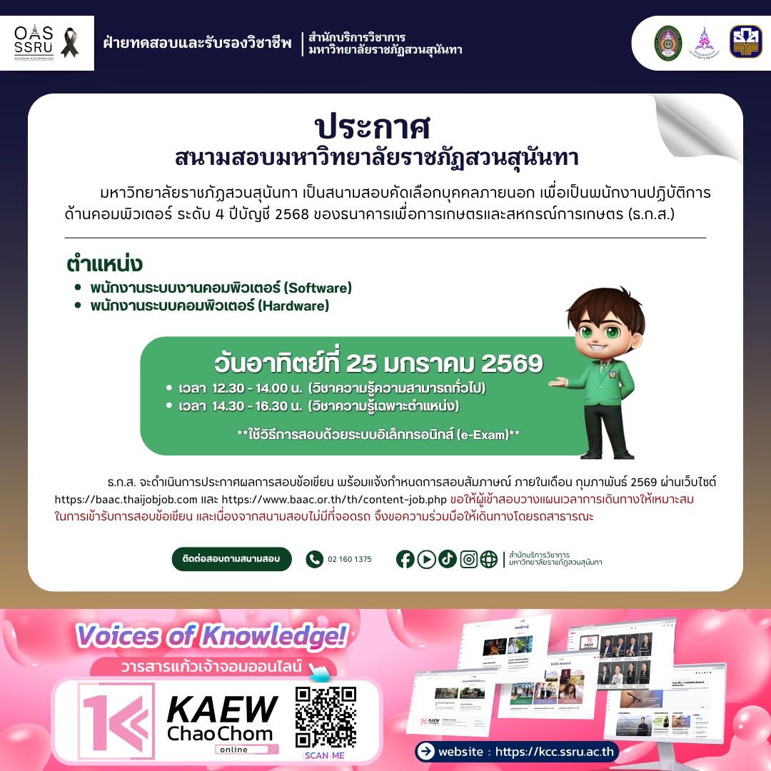 ข่าวกิจกรรม ประกาศจากสนามสอบ มหาวิทยาลัยราชภัฏสวนสุนันทา เป็นสนามสอบคัดเลือกบุคคลภายนอก เพื่อเป็นพนักงานปฏิบัติการ ด้านคอมพิวเตอร์ ระดับ 4 ปีบัญชี 2568 ของ ธ.ก.ส. มกราคม 23, 2026