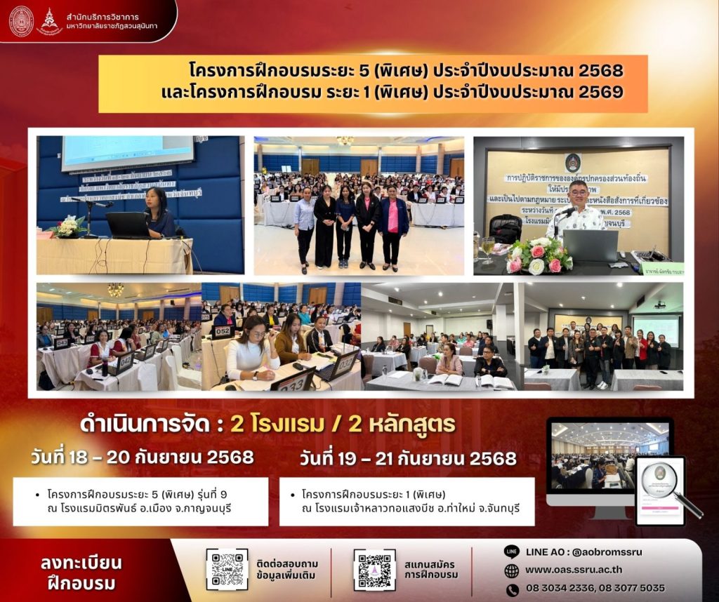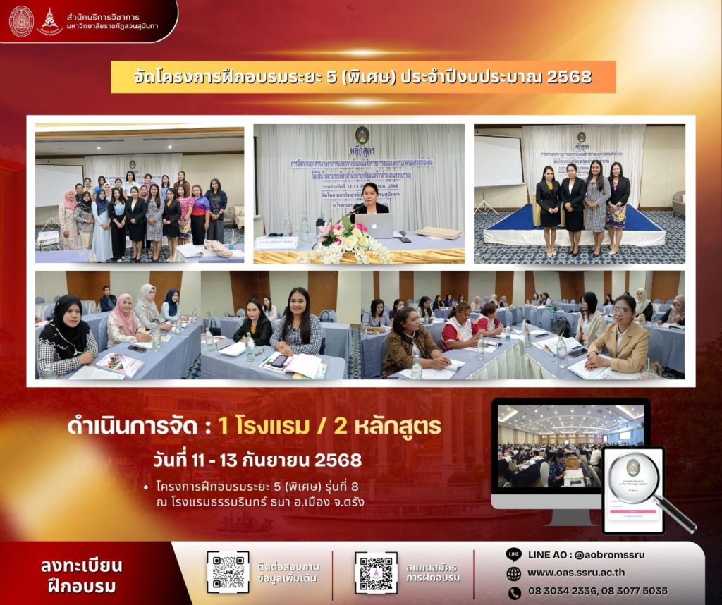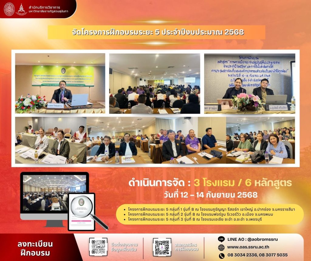 ฝ่ายวิจัยและพัฒนา สำนักบริการวิชาการ จัดโครงการฝึกอบรมระยะ 5 ประจำปีงบประมาณ 2568 จำนวน 2 โรงแรม 5 หลักสูตร (วันที่ 5 – 7 กันยายน 2568)