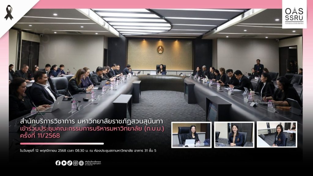 แชร์บทความ : On 12 November 2025 at 08:30, Asst. Prof. Dr. Panyada Chantakit, Director of the Office of Academic Services, together with Ms. Saowalak Jinbuay, Acting Head of Office, attended the 11/2568 meeting of the University Executive Committee. The meeting was presided over by Assoc. Prof. Dr. Chutikarn Sriwiboon, President of Suan Sunandha […]