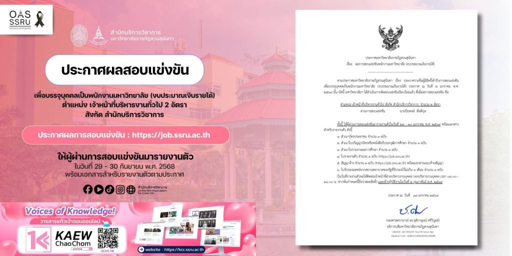 แชร์บทความ : Announcement of the results of the competitive examination for recruitment of university employees (income budget) for the position of General Administrative Officer, Academic Service Office, 2 positions. Those who passed the competitive examination are required to report for duty on January 29-30, 2026, with the necessary documents as per the […]