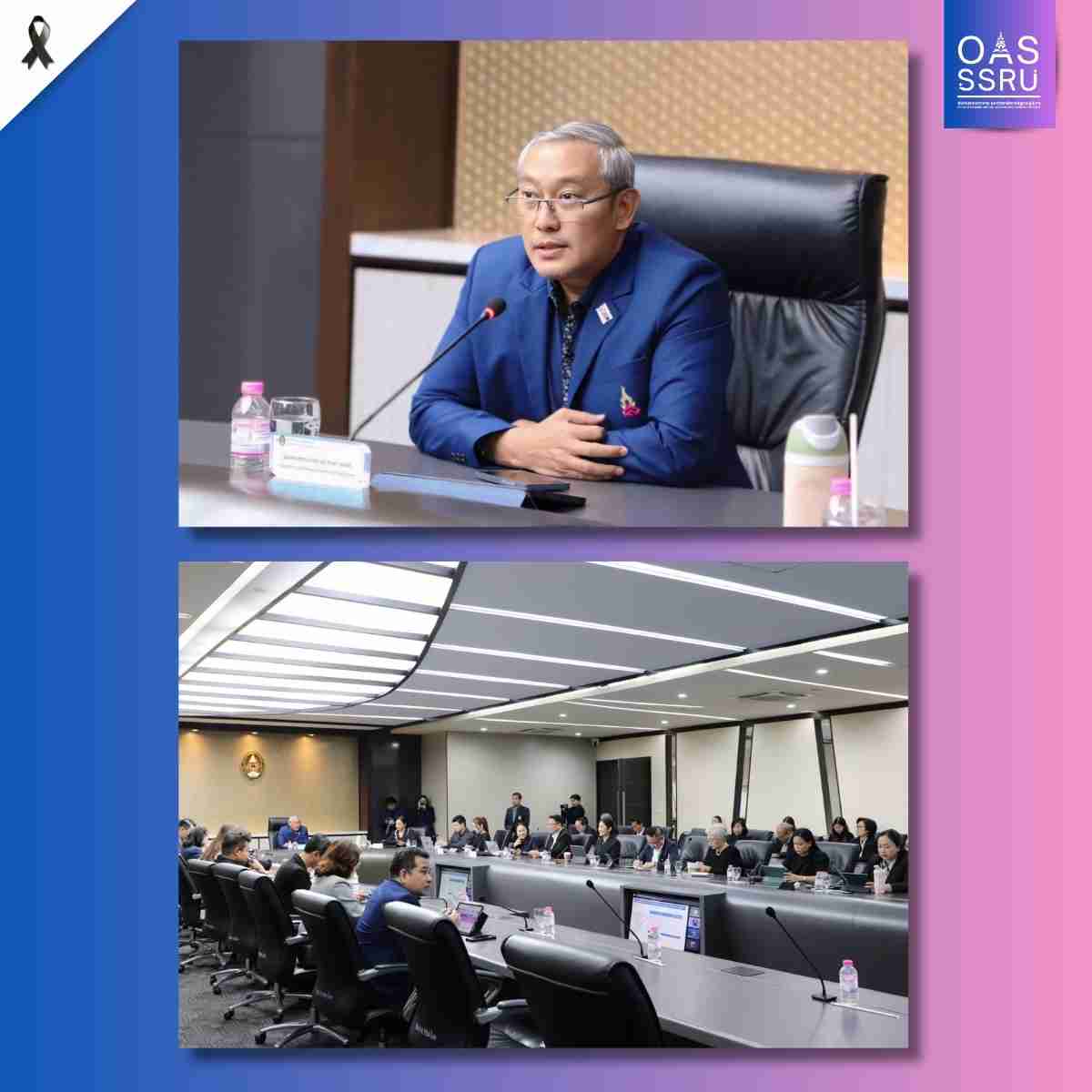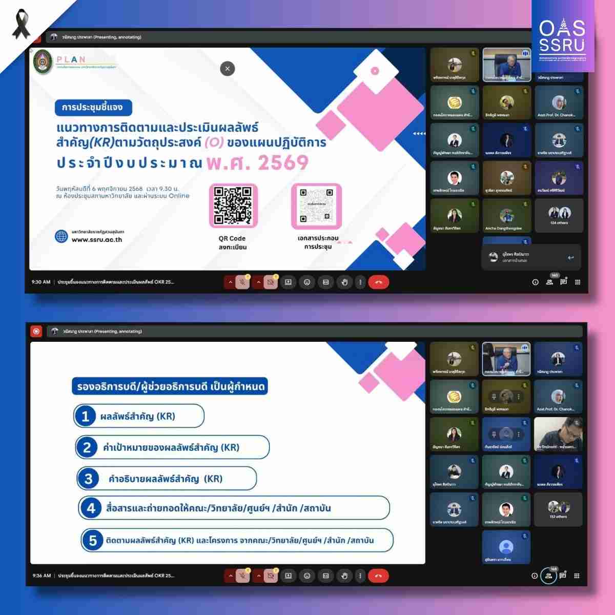 On November 6, 2025, at 09:30 AM, the Academic Services Office, led by Assistant Professor Suwita Pruksaporn, Deputy Director of Administration and Planning, along with Ms. Walaiphan Rattanathammanee, Head of Academic Services, and Ms. Sumintra Makiem, Policy and Planning Analyst, attended a meeting on guidelines for monitoring and evaluating Key Results (KR) in alignment with the Objectives (O) of the Fiscal Year 2026 Annual Action Plan. The meeting was presided over by Associate Professor Dr. Witthaya Mekkhum, Vice President for Planning and Quality Assurance, and held at the University Council Meeting Room, Building 31, 5th Floor, Suan Sunandha Rajabhat University, with participation via Google Meet.