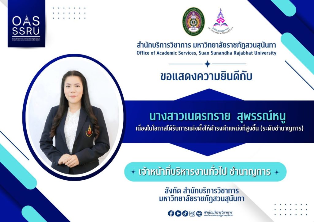 แชร์บทความ : Congratulations to Ms. Netrsai Supanhu, Staff of the Academic Services Bureau, Suan Sunandha Rajabhat UniversityOn the occasion of her promotion to a higher position at the Professional Level as “Senior General Administrative Officer”,the University Staff Executive Committee resolved to appoint university personnel to higher positions at its 5/2568 meeting held on 9 October 2025,presided […]