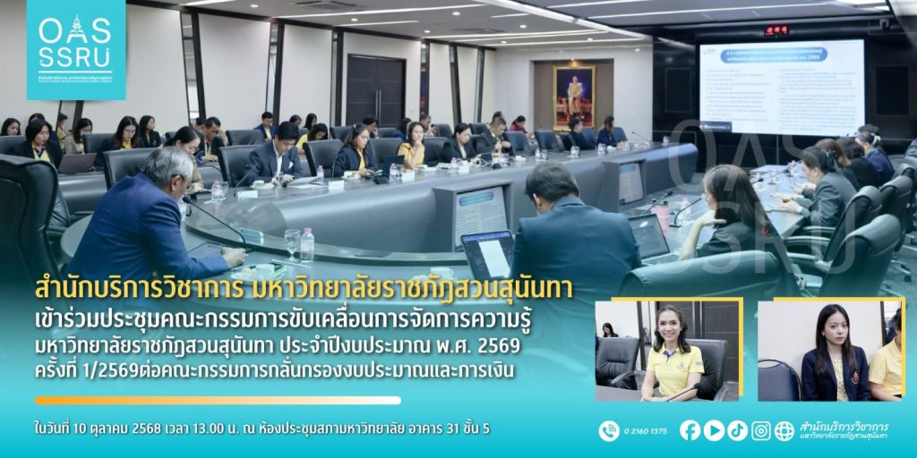 แชร์บทความ : On 10 October 2025, from 1:00 – 4:00 p.m., the Academic Services Bureau, led by Asst. Prof. Suwita Pruksaporn, Deputy Director of Administration and Planning, together with Ms. Sumintra Makiam, Policy and Planning Analyst, participated in the 1/2569 Meeting of the Knowledge Management Steering Committee of Suan Sunandha Rajabhat University for […]