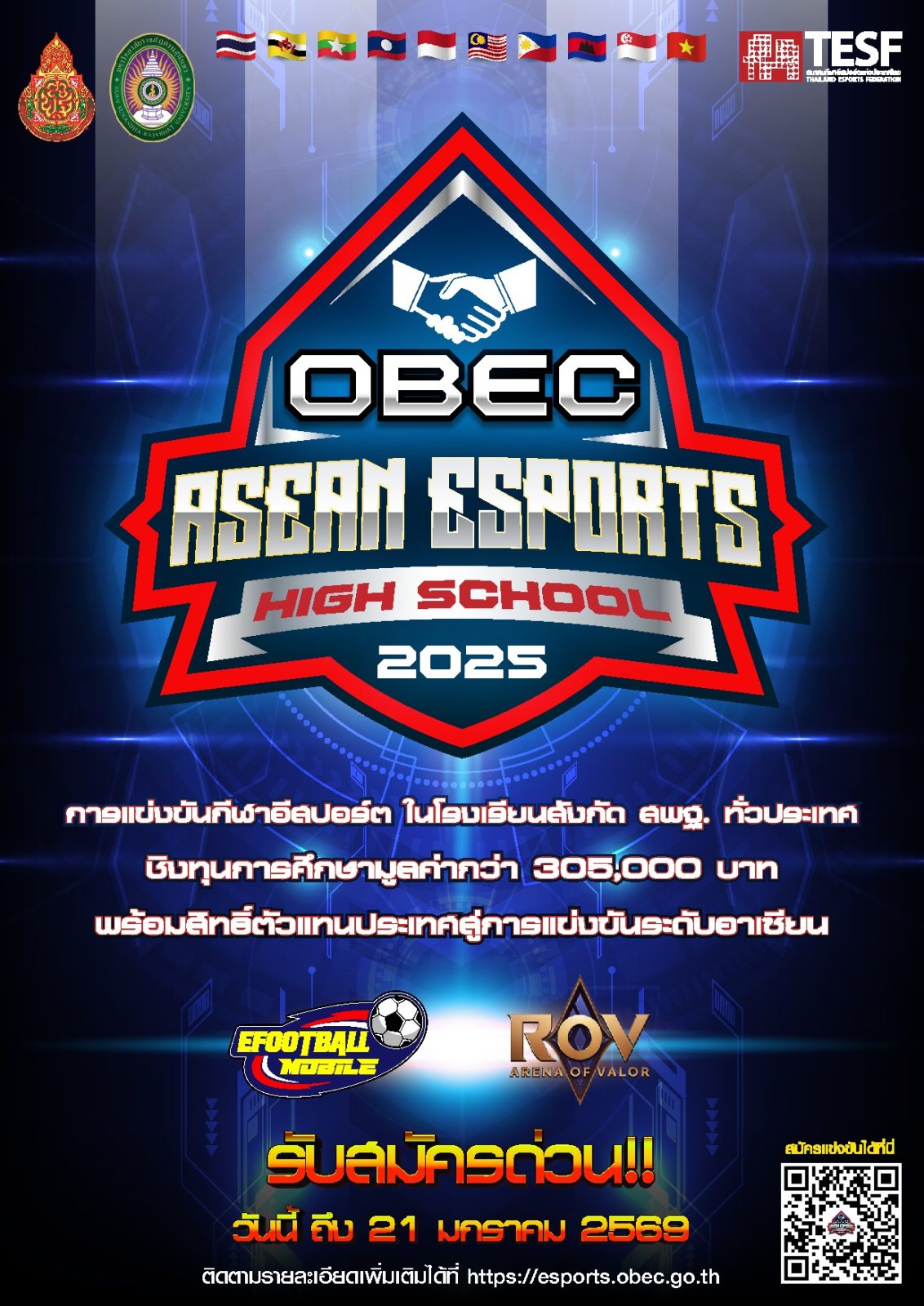News & Events The Office of the Basic Education Commission (OBEC), in collaboration with Suan Sunandha Rajabhat University and the Esports Association of Thailand, is recruiting high school students from OBEC-affiliated schools nationwide to participate in the national esports competition, “OBEC ASEAN ESPORTS HIGH SCHOOL 2025”. January 15, 2026