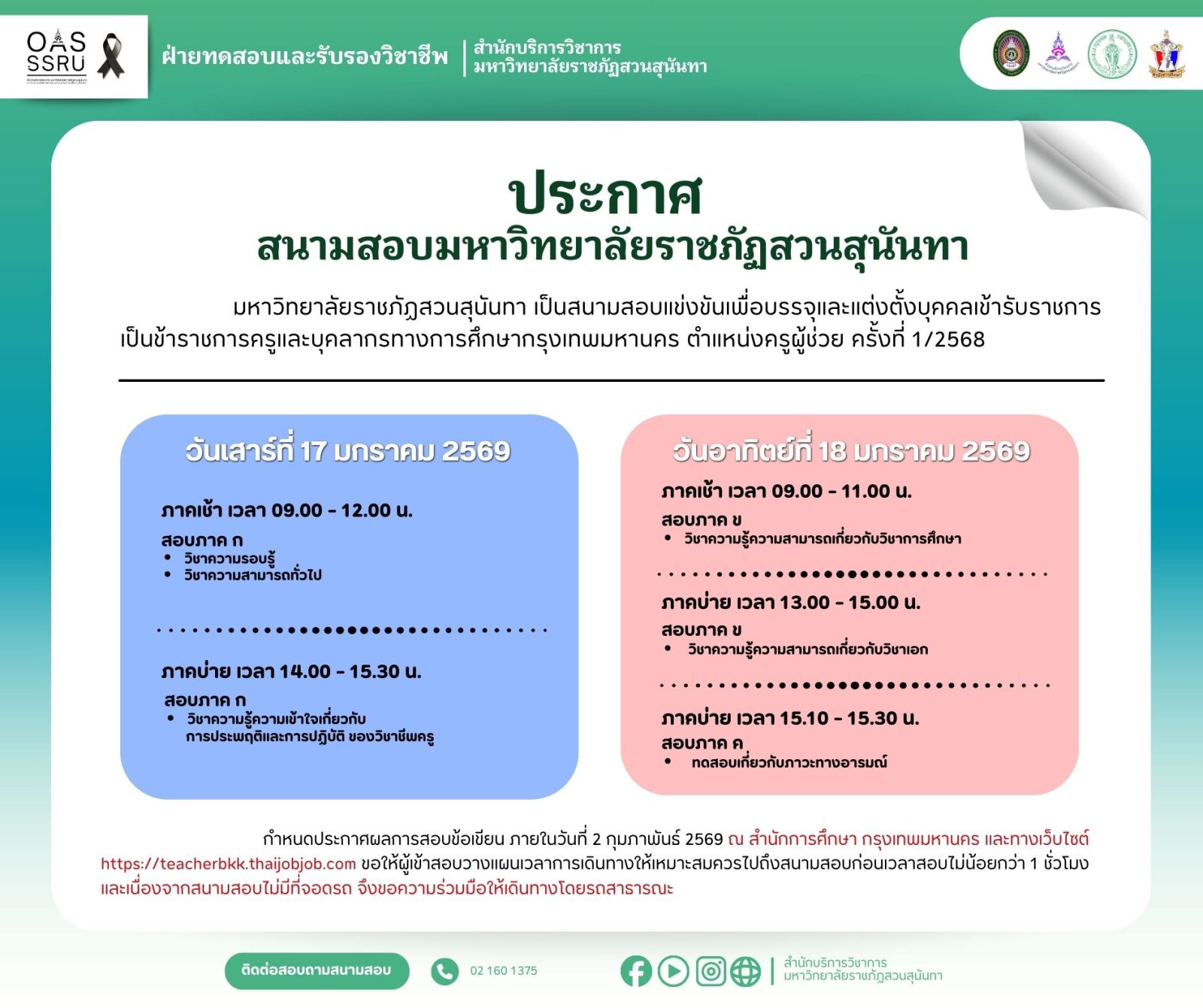 News & Events Announcement from the examination venue: Suan Sunandha Rajabhat University is the examination venue for the competitive examination for recruitment and appointment of individuals to government service as teachers and educational personnel in Bangkok, Assistant Teacher position, 1/2568 (First Examination of 2025). January 15, 2026